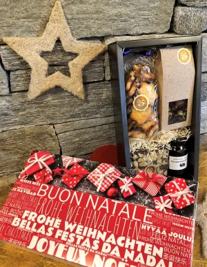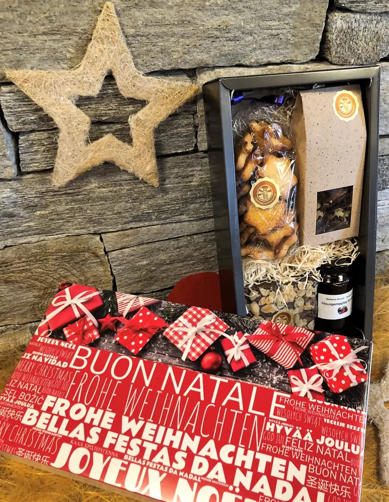Enthalten sind die bei unserer Kundschaft besonders beliebten Florentiner (150 gr.), ein Birnenschnitzbrot (450 gr.), hausgemachte Konfitüre und für den weihnachtlichen Geschmack ein Säckchen Mailänderli (300 gr.).