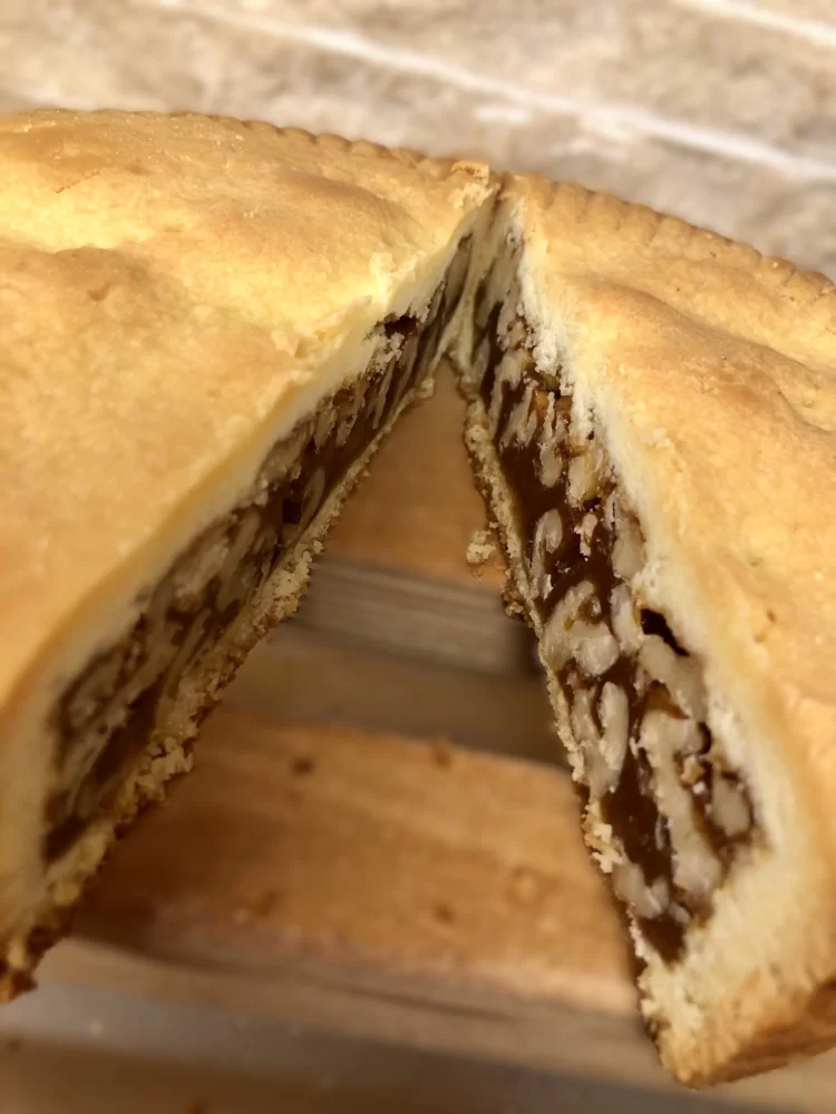 The history of the nut tart is closely linked to the tradition of emigrant Engadine confectioners. Thanks to "Bacher Urs", Amadeo's father, it found its way to the south side of the Simplon. The vanilla-flavoured shortcrust pastry encloses a firm mass - the core of every nut tart and also the secret of every baker. The Simplon version contains cream, sugar, honey and walnuts.